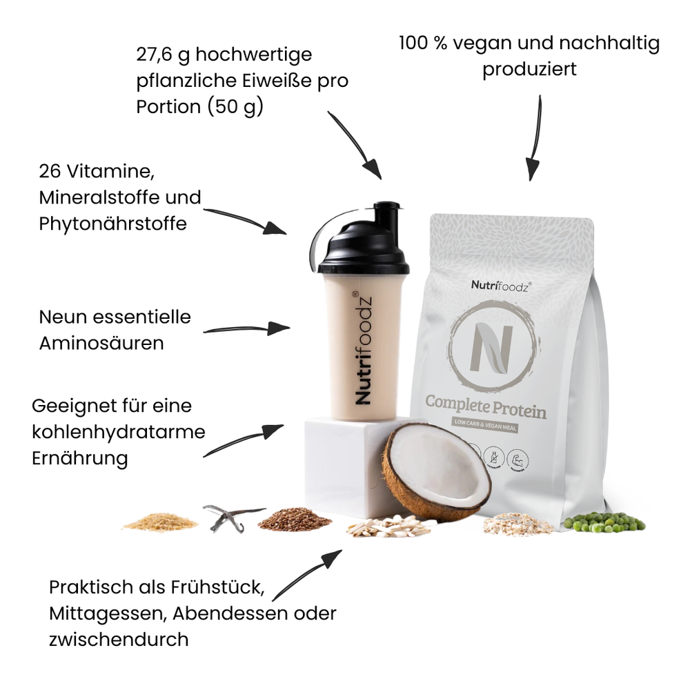 De Complete Shake is een uitgebalanceerde plantaardige maaltijd en biedt een mix van zorgvuldig geselecteerde ingrediënten, waaronder eiwitten, vezels en essentiële voedingsstoffen in één handige shake.