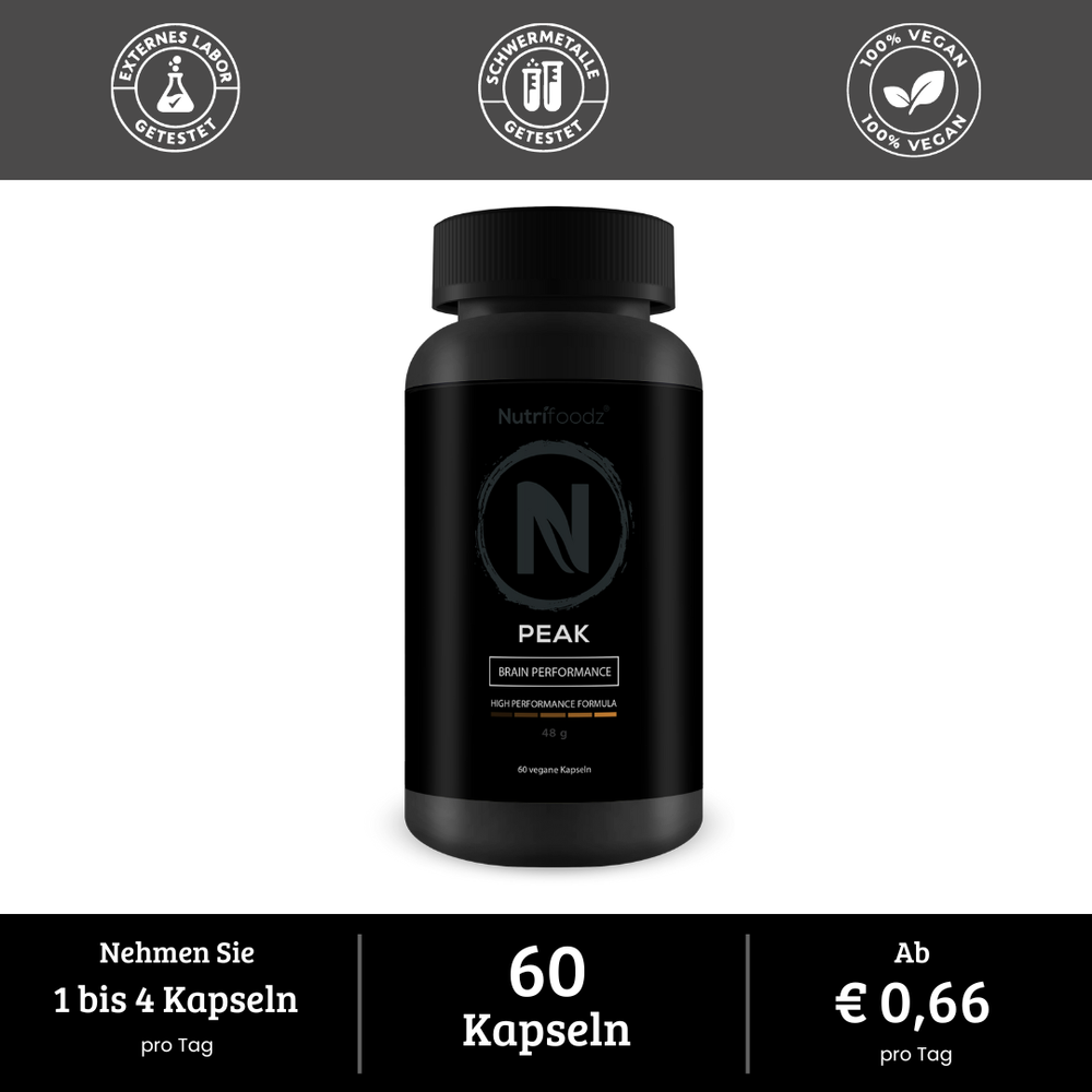Zonder tijdelijke pieken. PEAK bevat geen stimulerende middelen zoals cafeïne, maar biedt een langdurige ondersteuning voor mentale prestaties en focus.