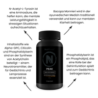 PEAK bevat Alpha GPC en CDP-choline, die bijdragen aan een gezonde hersenfunctie en het behoud van mentale helderheid.