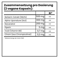 Zutaten : Berberinextrakt, Alpha-Liponsäure (ALA), HPMC (Hydroxypropylmethylcellulose – Kapselhülle), Resveratrol, mikrokristalline Cellulose (MCC), Magnesiumstearat, Siliciumdioxid, Piperin, Inositol (Vitamin B8), Chrompicolinat